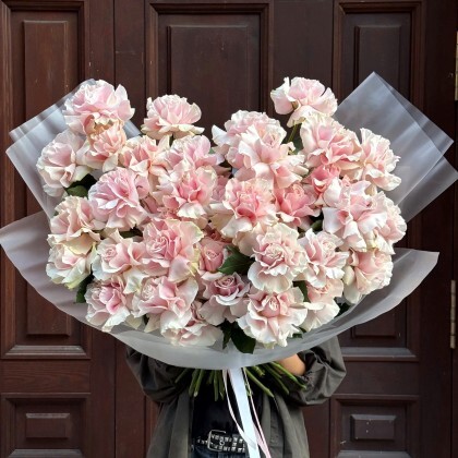 Большой букет нежных французских роз с ажурными лепестками. Роза французская белая - 25 шт. Авторская упаковка - 1 шт.