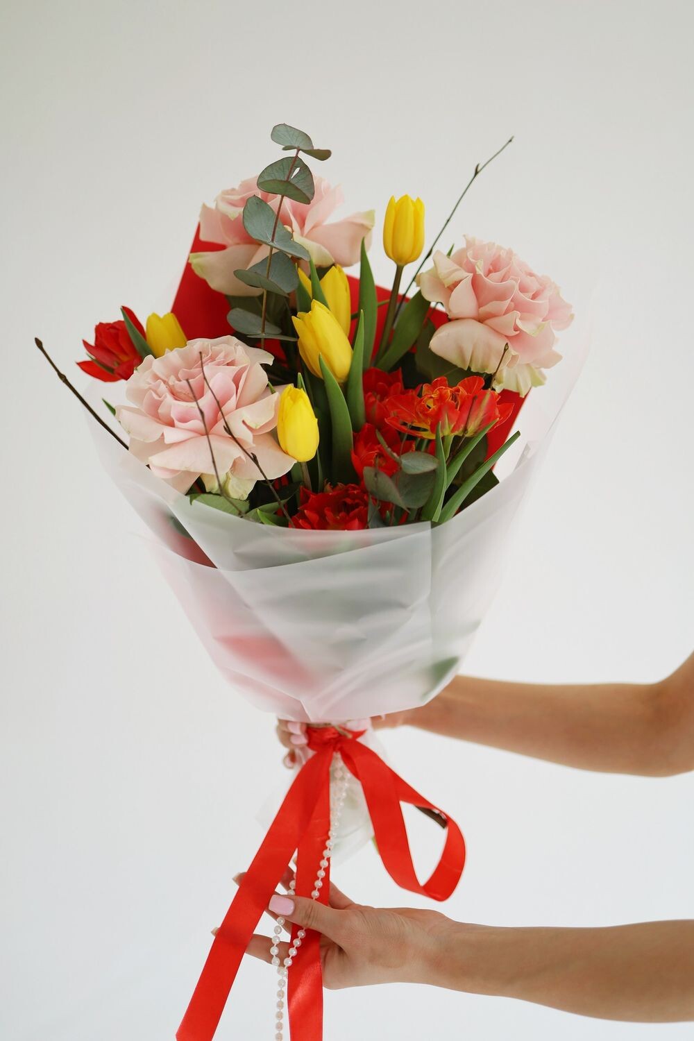 Тот самый весенний день с ярким солнышком и запахом тепла. в состав входят: французские розы, яркие тюльпаны, ветки эвкалипта и ветки берёзы.