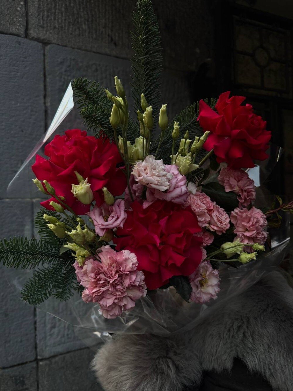 В составе: французская роза/ лизиантус/ диантус/ леукотоэ/ кустовая роза.