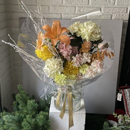 В составе: заснеженная берёза/ паникум сухоцвет/ гвоздика/ роза вегги/ лизиантус/ лилия/ французская роза/ кустовая пионовидная роза/ гвоздика кустовая.