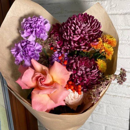 Состав: Хризантема 5 шт., эвкалипт 1 шт.