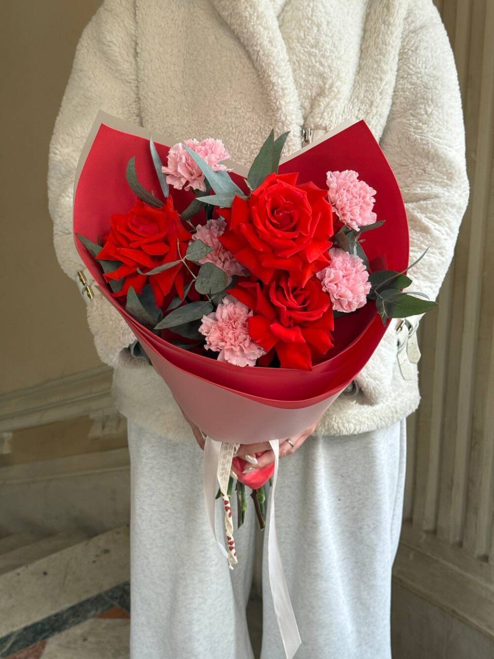 Состав: Роза французская 3шт Гвоздика 5шт Эвкалипт