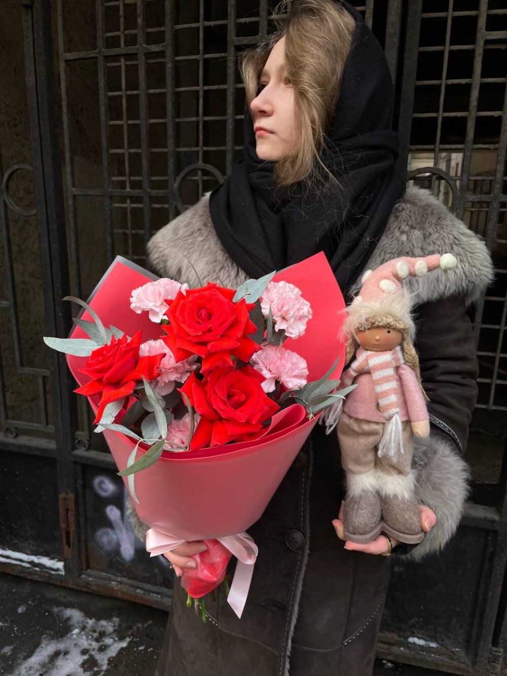 Букет с французскими розами, гвоздикой и игрушкой девочкой