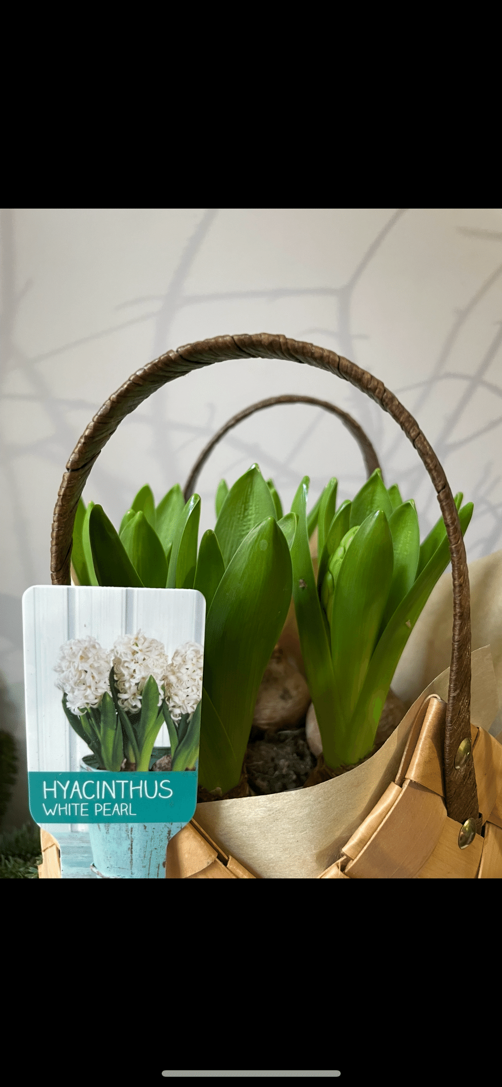 Пять луковиц белых гиацинтов в горшочке и сумочке