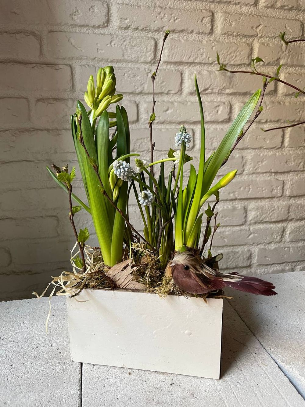 Луковичные мускари, нарцисс и гиацинт в деревянном кашпо