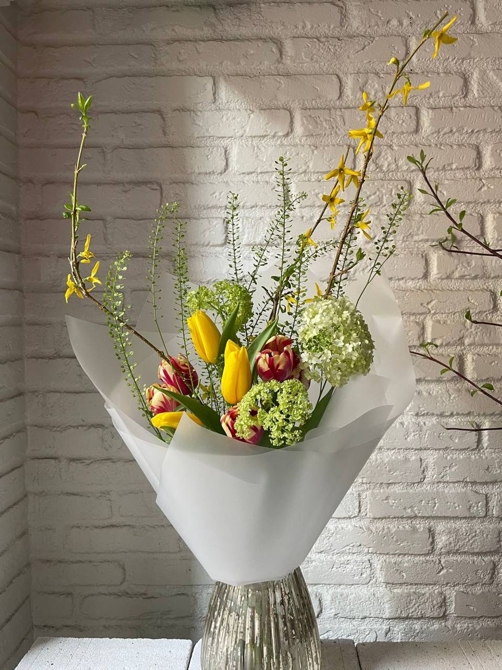 Состав: Форзиция 1шт Вибурнум 1шт Тюльпан 9шт Грин белл 1шт
